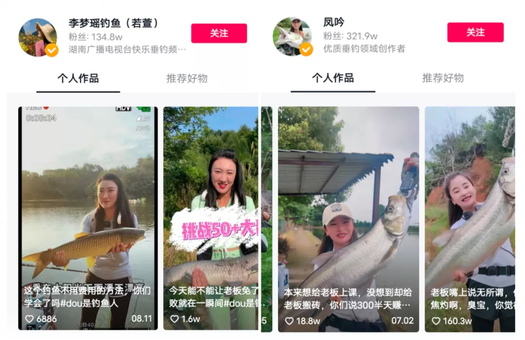 李梦瑶是湖南广播电视台快乐垂钓频道的主持人,凭着工作和对钓鱼的热爱,她在抖音上已收获近135万粉丝;另外一位美女钓手凤吟,从去年九月开通抖音账号至今不到一年,已轻松坐拥三百多万粉丝。