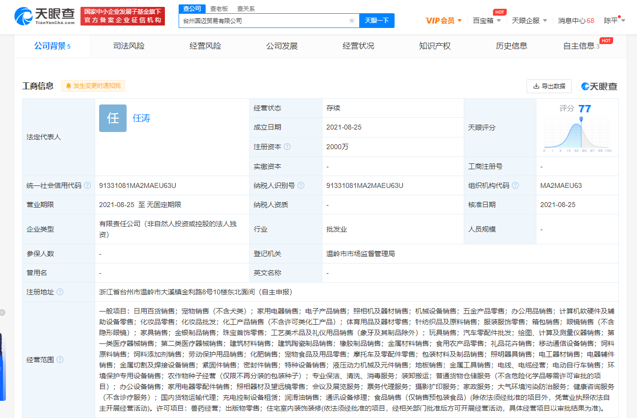 据天眼查APP显示,8月25日,台州圆迈贸易有限公司成立,法定代表人为任涛,注册资本2000万,经营范围包括日用百货销售;宠物销售;家政服务;住宅室内装饰装修等。股东信息显示,该公司由北京京东世纪贸易有限公司全资控股。