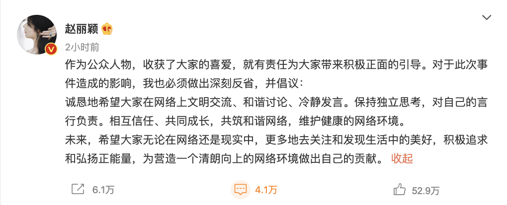 8月25日,赵丽颖发布微博表示,对其粉丝和王一博方的“饭圈互撕”事件造成的影响,自己作出深刻反省,并倡议大家在网络上文明交流、和谐讨论、冷静发言。之前,赵丽颖粉丝因抵制与王一博二搭新剧引发“网络骂战”,双方互相攻讦,除了相关粉丝和官方后援会以外,赵丽颖工作室也被新浪站方禁言。