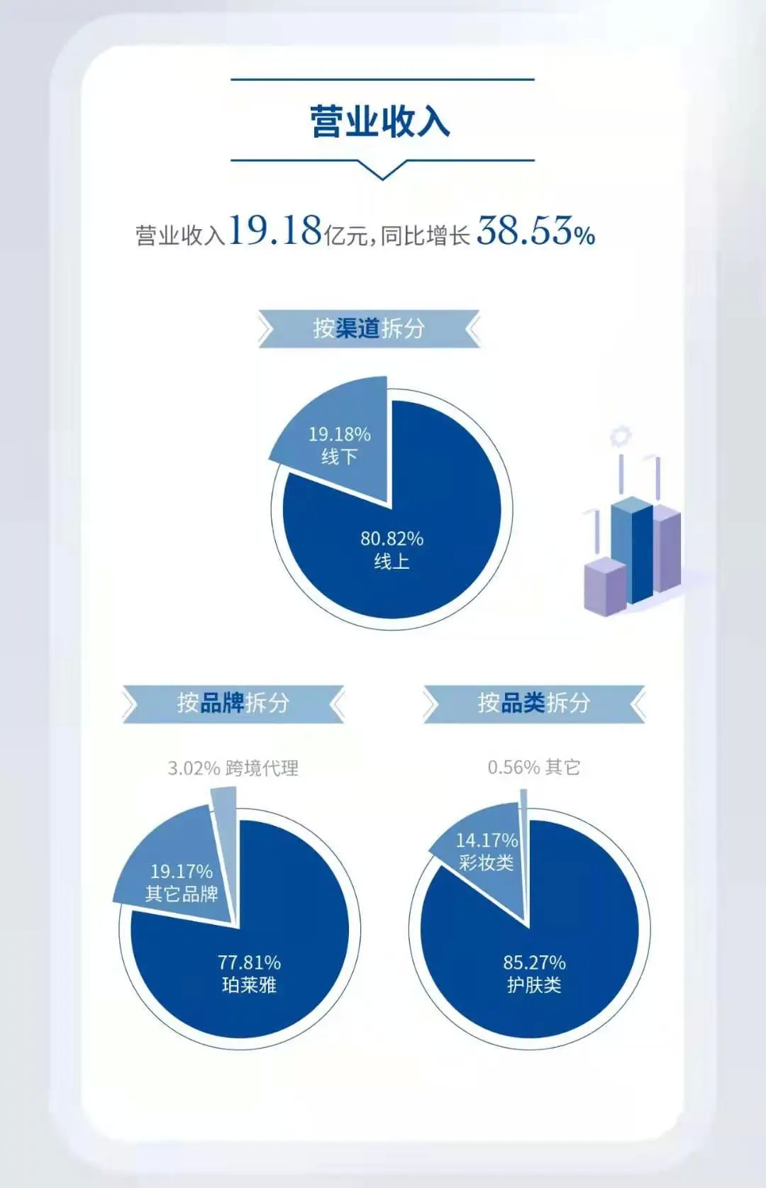 按品类拆分,护肤类占营业收入的85.27%,彩妆类占14.17,其他占0.56%;按品牌拆分,珀莱雅品牌依旧是主力军,占比为77.81%,其他品牌占19.17%,跨境代理占3.02%。