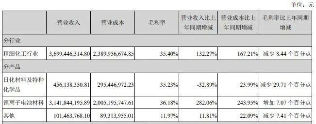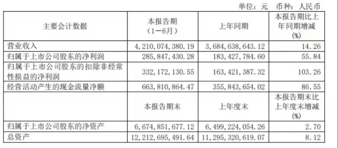 8月23日晚间,天赐材料披露了2021年半年度报告。今年上半年,实现营业收入36.99亿元,同比增长132.27%;实现归母净利润7.82亿元,同比增长151.13%;扣非净利润为7.66亿元,同比增长146.48%。