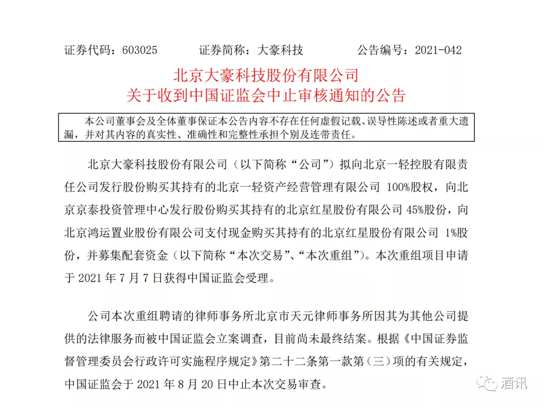 大豪科技和红星股份的重组在2020年12月7日公之于众,彼时大豪科技对外宣布,拟通过发行股份及支付现金相结合的方式直接、间接收购红星股份100%股权。该重组项目申请于 2021年7月7日获得中国证监会受理。
