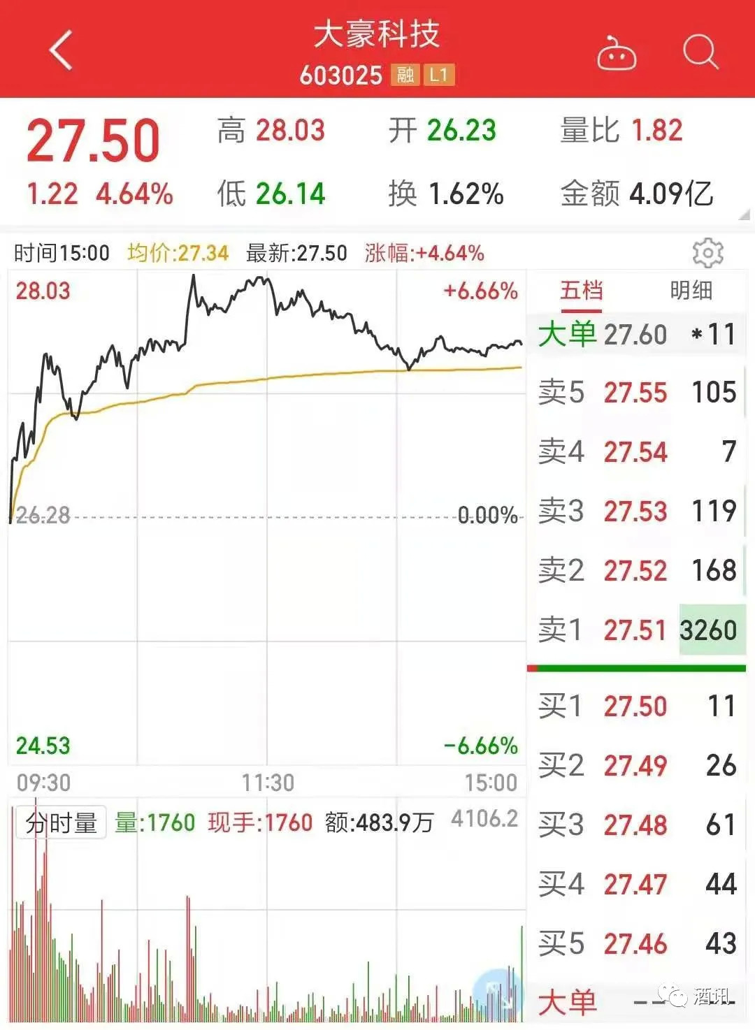红星股份敲门,大豪科技盘面上的幸福也来了。股价走势曲线上,12连板只是个开始,尽管2021年初经历了一段时间的波动,但资金热情仍然将其股价推高至47.99元/股,市值超过444.39亿元。