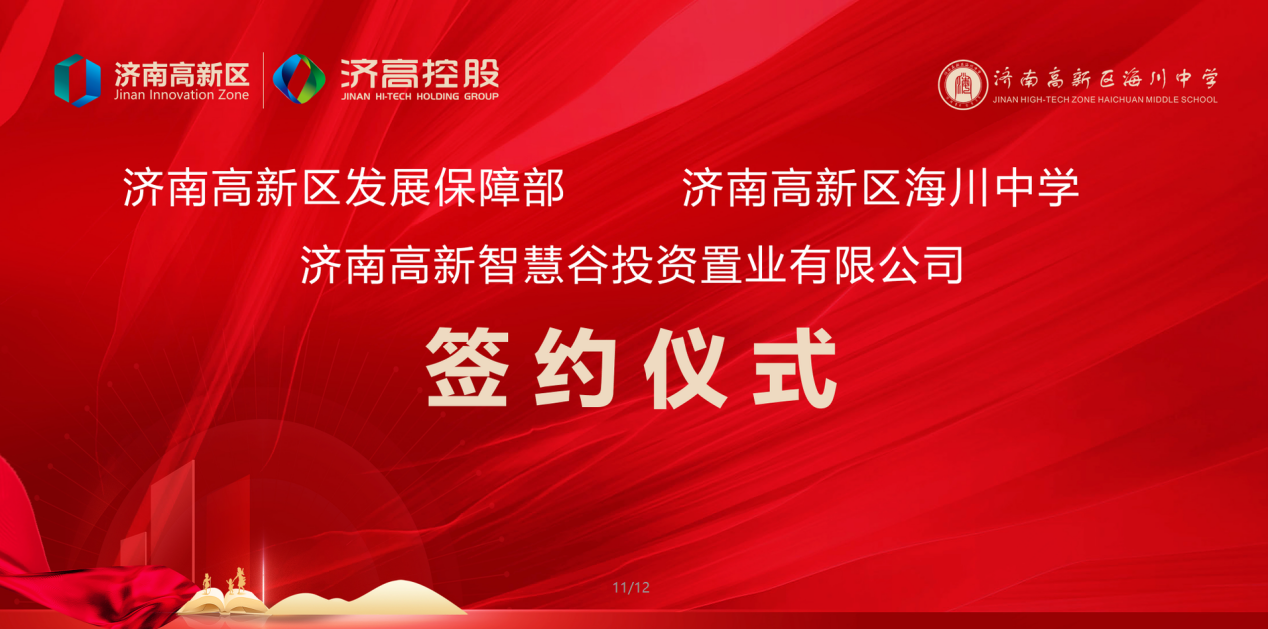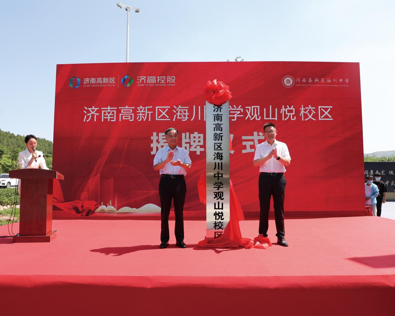 签约活动上,由济南高新区党工委委员、管委会副主任、国家信息通信国际创新园服务中心常务副主任李怀东和党工委委员、管委会副主任、济高控股集团董事长李昊共同为济南高新区海川中学观山悦校区揭牌。