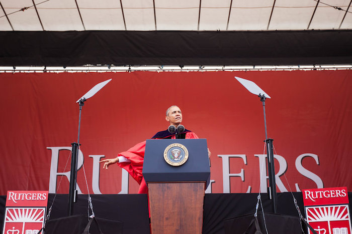 身穿深红色的长袍和黑色饰带,头戴一顶紫色的学士帽,奥巴马周日在美国罗格斯大学(Rutgers University)毕业典礼暨250年校庆上发表的演讲虽然并没有指名道姓,但是暗讽目标明显,甚至赢得了在场毕业生的阵阵欢呼。