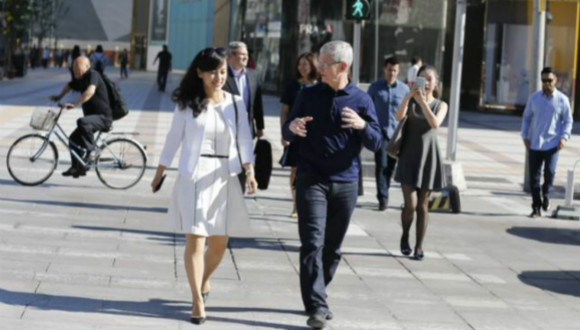 当5月16日早上,库克与柳青两位总裁从王府井步行街走入这家在亚洲规模数一数二的苹果店的时候,这条热闹的街道尚未苏醒,以至于很多媒体都没有捕捉到他们乘坐的车辆,当这辆低调的出租车消失在北京周一早高峰的时候,苹果CEO蒂姆·库克就这样低调地开启了他的年度访华之旅。