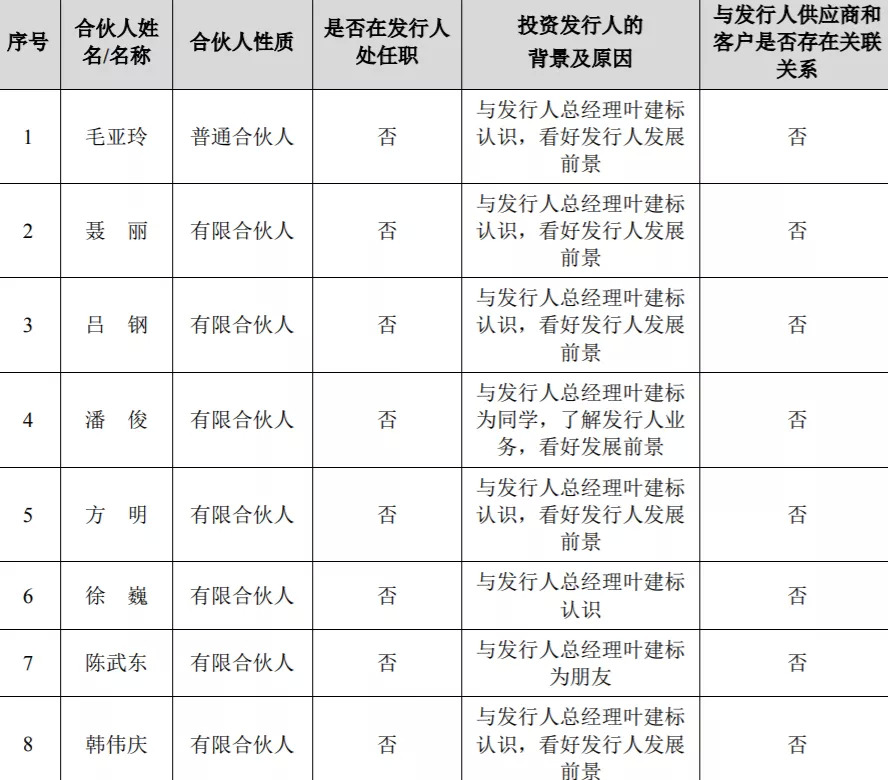记者注意到,上述三家机构并不仅是投资公司,其合伙人大多系公司实控人的朋友。对于投资公司的原因,这三家机构的合伙人大多给出的理由系“与实际控制人俞永方或叶建标相识/互为朋友,因看好公司的发展前景而入股”。