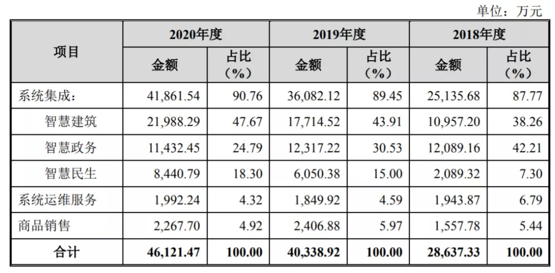 从收入构成上看,2020年度,智慧建筑、智慧政务、智慧民生分别给公司贡献了47.67%、24.79%、18.3%的收入;另一边,从销售区域来看,公司在报告期内的营业收入主要来自于浙江省内项目,完成的浙江省内项目为公司贡献了98.75%、86.87%、86.48%的收入,销售区域较为集中。