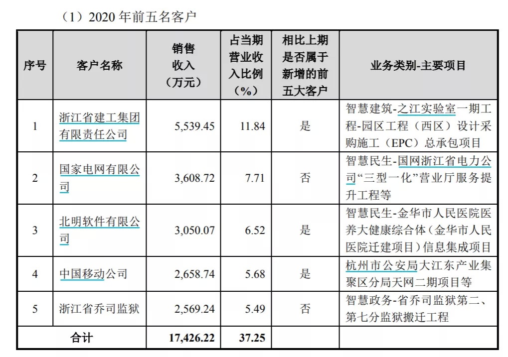 除了浙江省乔司监狱之外,2020年,公司的前五大客户还包括了浙江省建工集团有限责任公司、国家电网有限公司、北明软件有限公司和中国移动。当年,前五大客户一共为华是科技贡献了1.74亿元的收入,在公司当期营业收入中占比37.25%。