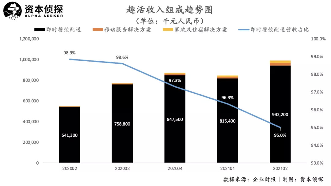移动及家政两块业务确实增速可观,但由于基数太小,实际上在趣活总营收中的存在感仍较为微弱。二季度,趣活实现总营收为9.9亿人民币,其中即时餐饮配送业务贡献了9.4亿,占比仍高达95%。