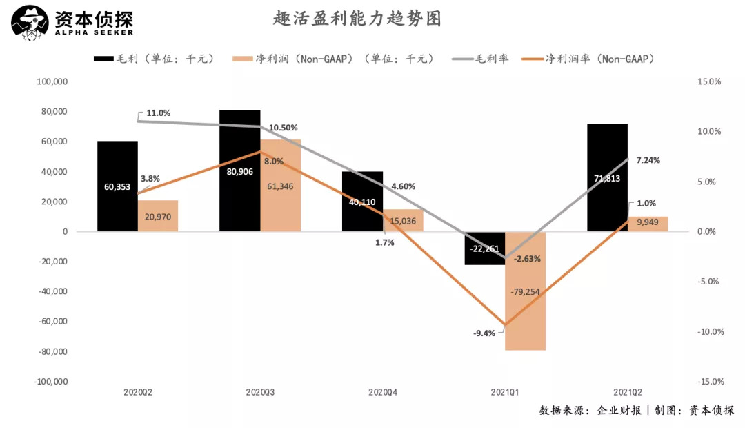 以Non-GAAP计算,趣活Q2实现经调整净利润为995万元,同比下降52.6%,环比由亏转盈,经调整净利润率为1.0%,实现经调整EBITDA为2911万人民币。营收规模持续扩张的情况下,成本及费用控制上的波动,让趣活盈利水平存在不稳定性。