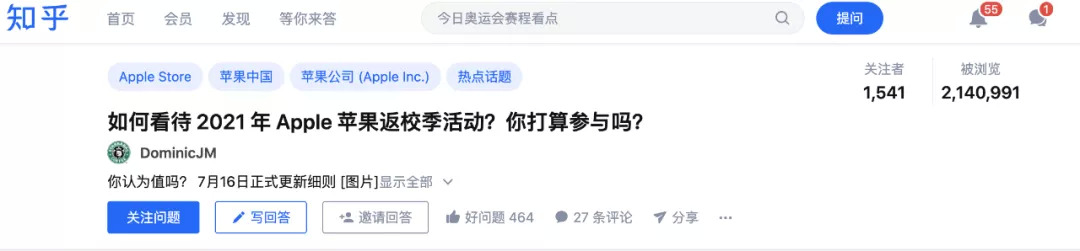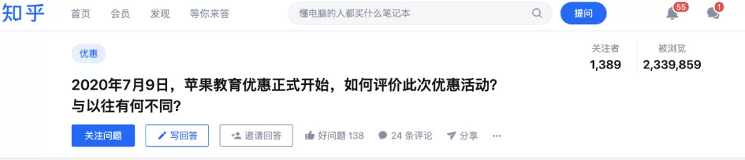 也因此,教育优惠和返校促销活动(以下统称教育优惠)也成为苹果官方每年最受期待的优惠活动,基本上每年过了四、五月份,不少人就开始期待苹果的教育优惠活动,每年教育优惠推出后,也会在网上引发大量的讨论,比如2021年和2020年扽教育优惠活动都在知乎上引发了大量的雇主。