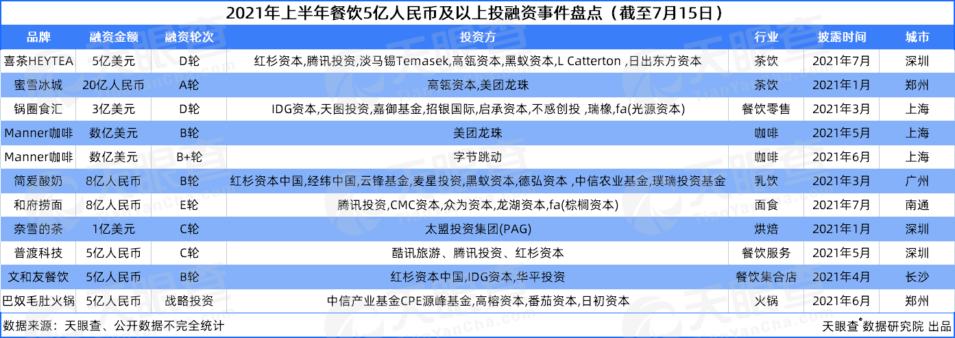 加速恢复中的餐饮行业,也迎来了新一轮投资热潮。据天眼查数据研究院分析,截至2021年7月中旬,餐饮行业融资事件已达125起,整体融资额达75亿人民币左右。其中,融资过亿事件超40起,占整体融资事件数量的32%,而10亿人民币以上的融资事件有6起,均集中在茶饮、咖啡领域。