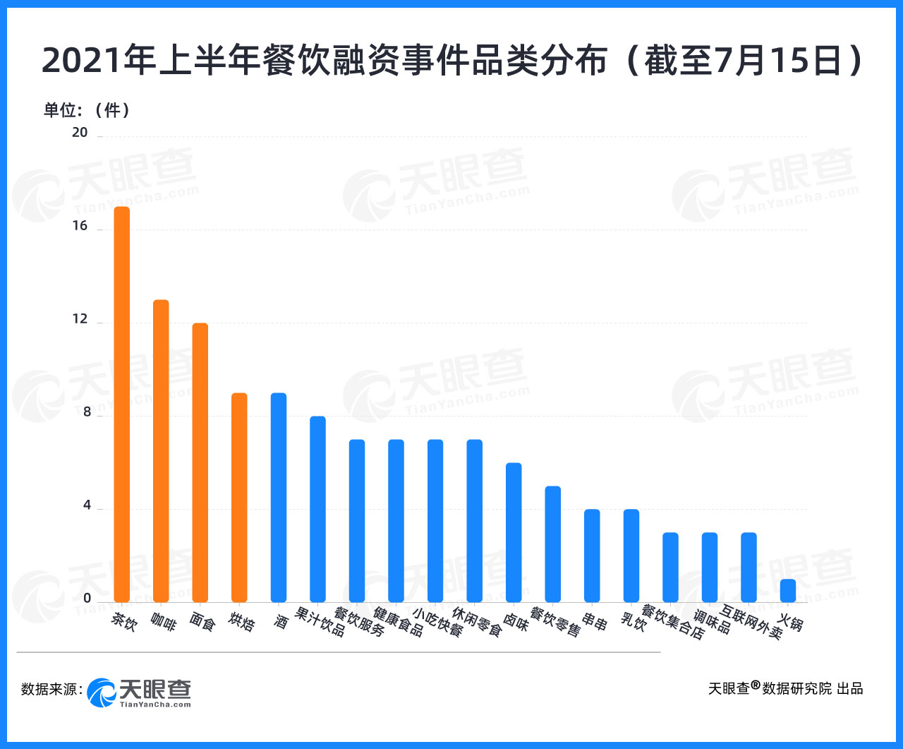 从品类分布来看,2021年上半年,餐饮融资事件TOP3品类为茶饮、咖啡、面食。其中茶饮融资事件最多,共计17起,咖啡、面食次之,分别为13、12起;零售属性较为突出的烘焙、酒类等品类处在融资第二梯队;第三梯队则细分品类扎堆,比如串串、乳饮、调味品等。