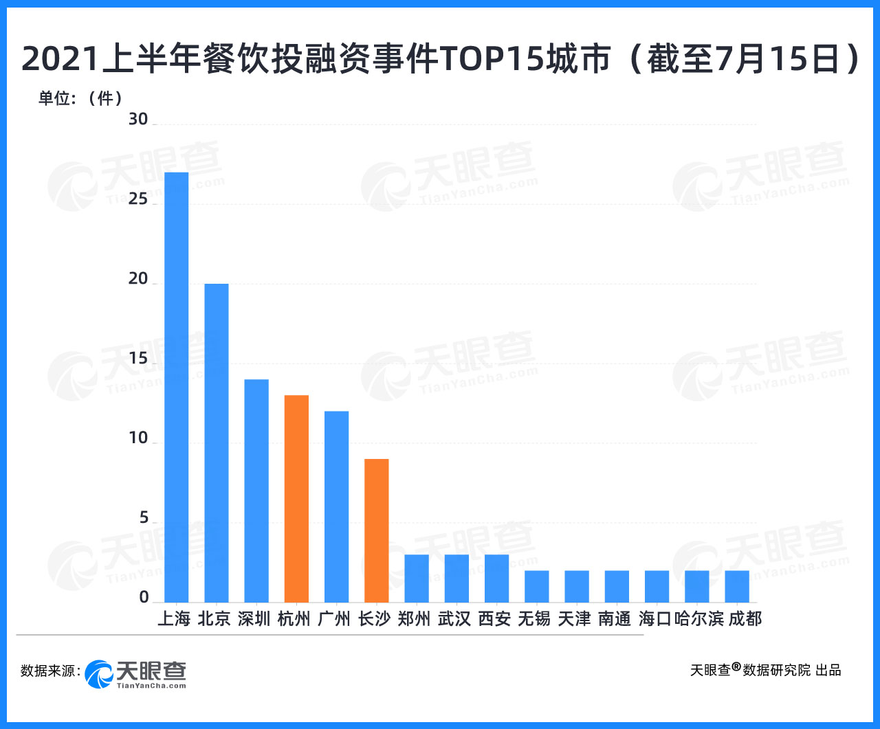 随着消费升级,渠道下沉,新一线、二线城市已经成为连锁餐饮发力的主力城市。在上半年的餐饮投融资热潮中,新一线、二线城市表现也比较突出。在餐饮融资TOP15的城市分布中,上海、北京、深圳虽居前三,但以杭州、长沙为代表的新一线城市已紧随深圳、广州,进入上半年餐饮融资第二梯队,无锡、南通等二线城市也超越多个新一线城市,闯进第三梯队。