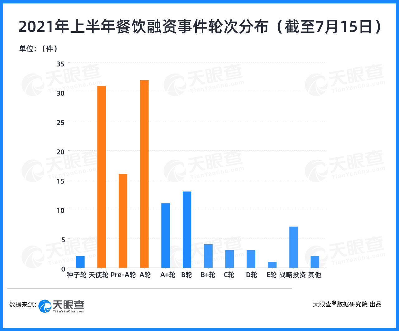 在融资轮次分布上,目前,整体餐饮行业资本化程度不高。A轮及之前的融资事件数量占整体融资事件2/3,A轮融资事件最多达32起,天使轮次之共31起。可以说,上半年餐饮行业的整体融资情况与目前行业所处的“初级资本化”阶段大体相当。