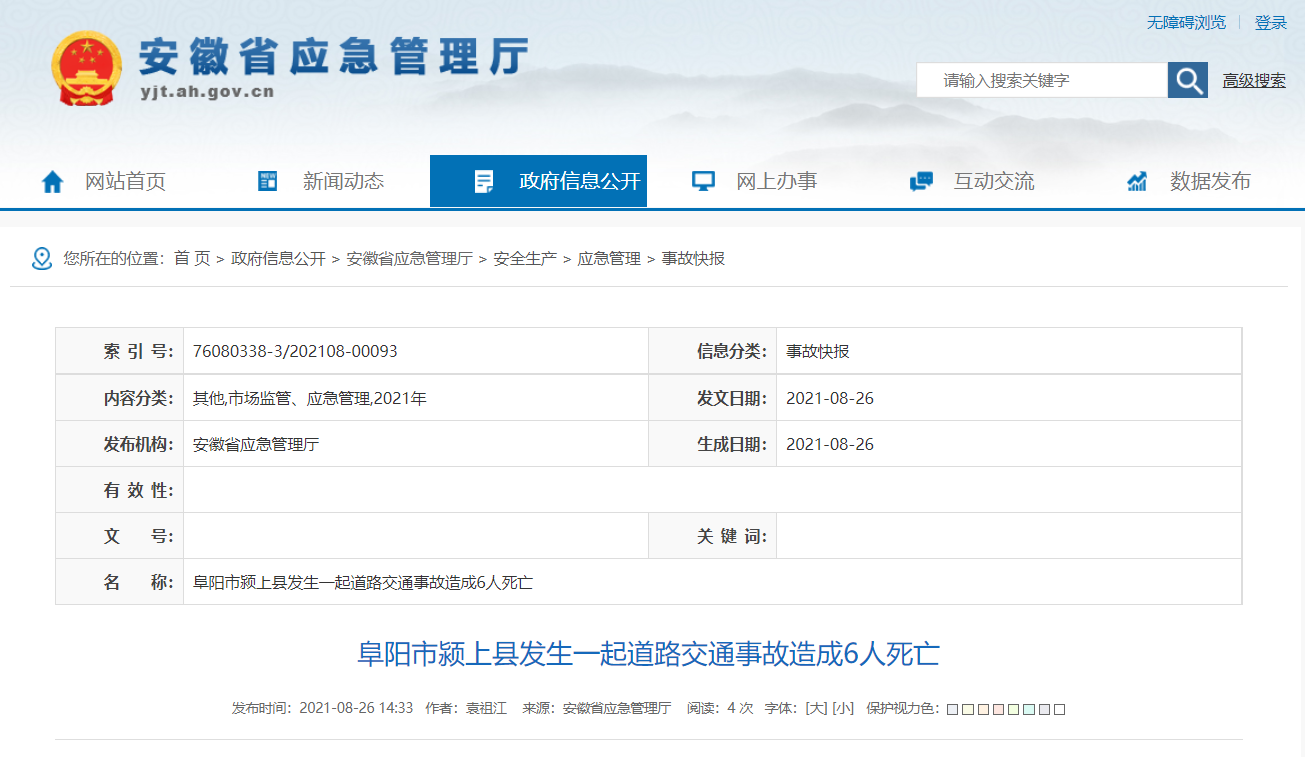 安徽省应急管理厅网站消息,8月25日23时许,阜阳市颍上县刘集乡三优集村一私家比亚迪商务车途经S431省道3KM+950M处逆向驶入对面车道,翻至路边沟中,车上乘坐8人,其中6人送医院抢救无效后死亡,另外2人生命正常。事故调查和善后处置工作正在进行中。