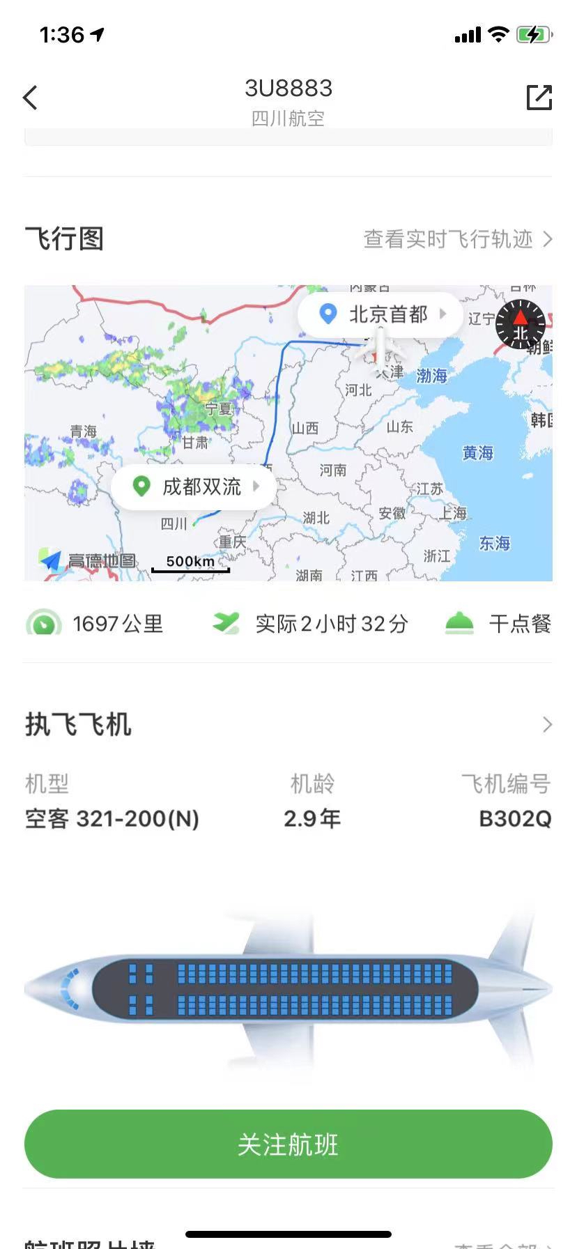 界面新闻查看航旅纵横显示,该航班实际飞行2小时32分,共1697公里,执飞飞机为空客321-200(N)。