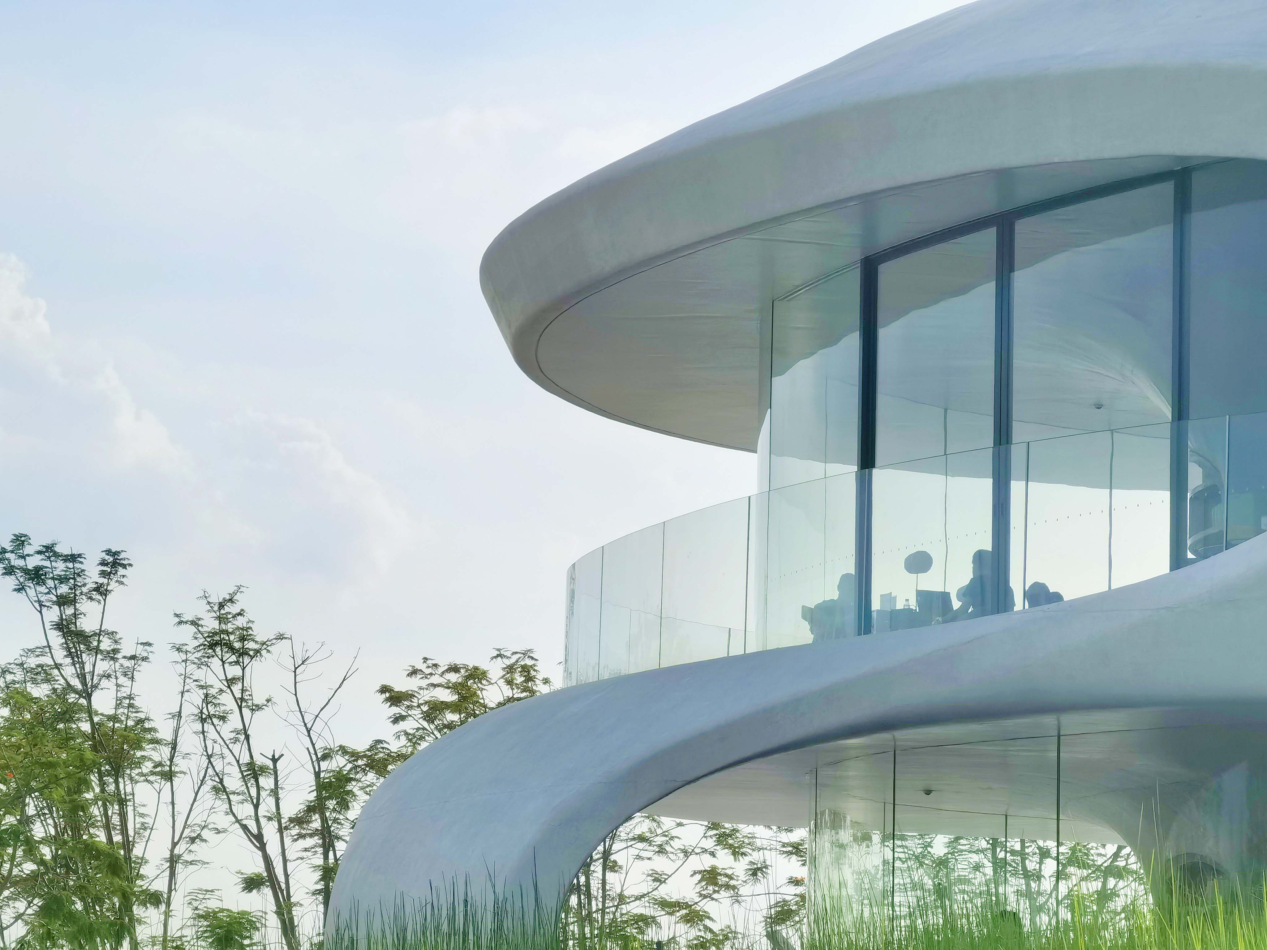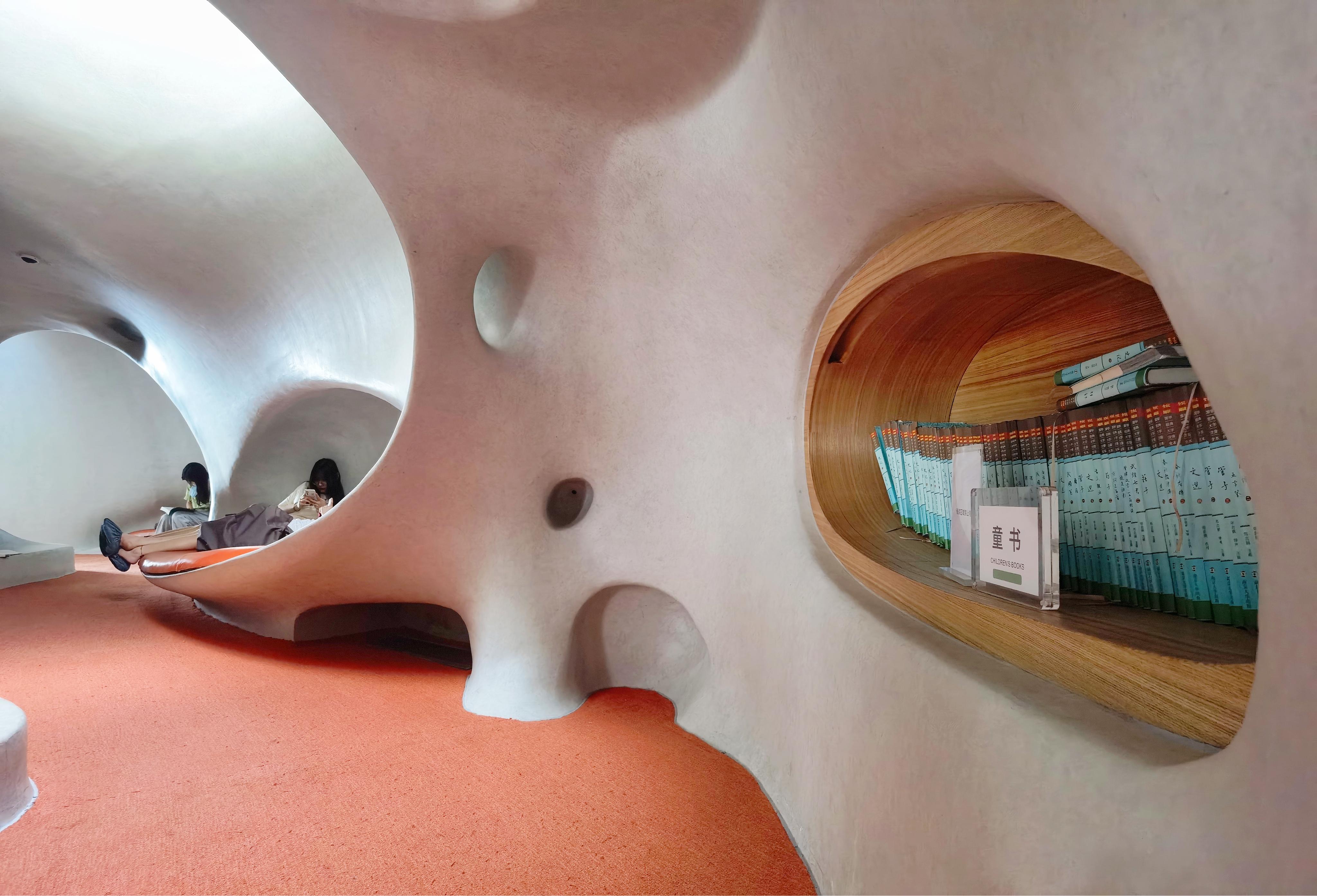 云洞图书馆不同于传统概念中的建筑,其外观通体洁白,呼应了“云洞”这一名称;而内部是一个流线型的、连续的有机空间,内部共有两层,一层造型采用“洞+”的概念,二层引入“晓岛”阅读空间,可存放万本图书,包含阅读区和屋顶露台。