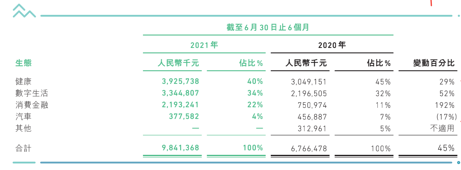 具体来看,在众安的五大生态方面,健康生态收入占比45%,排名第一。