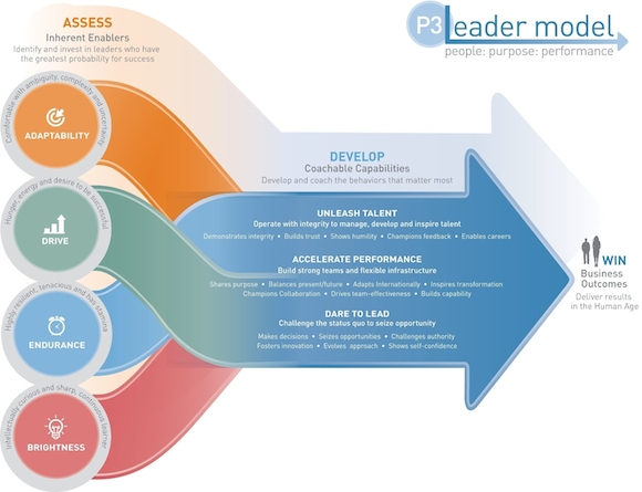 在2015年调研了全球400名商业领导者后,睿仕管理顾问提出P3领导力模型——P3指的是人(people)、目的(purpose)和表现(performance)。提出该模型的出发点是,领导力的衡量标准除了企业的财务表现还应包括对人才的运用开发状况,比如实现职场人才多样性、提升员工使命感、为员工提供职业发展的资源与机会等。