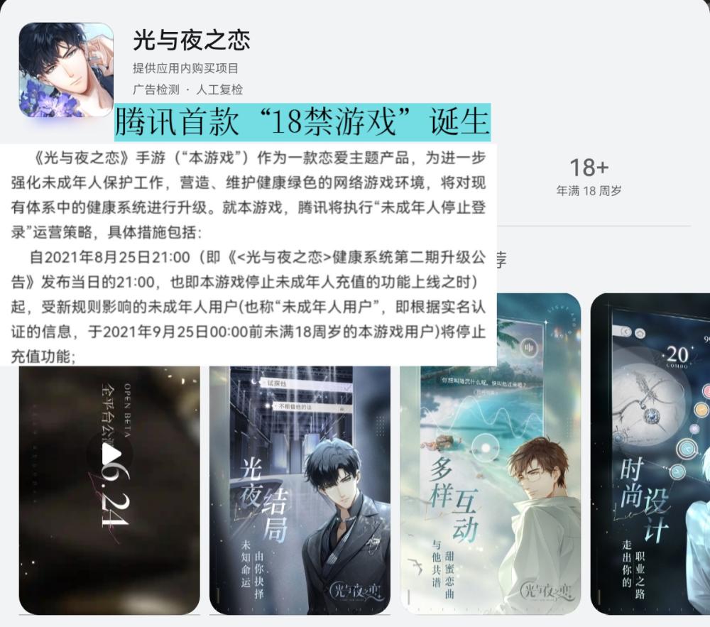 《光与夜之恋》也因此成为国内第一款完全禁止未成年人登录的手游。