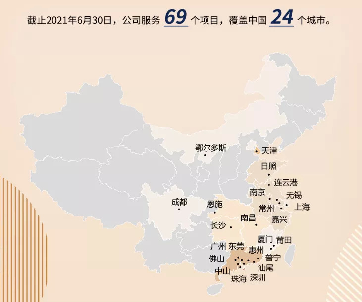 公司凭借强大的业务能力,不断拓展商业版图,立足大湾区,走向全国市场。截至2021年6月30日,公司服务69个项目,其中在大湾区的项目44个,长三角地区的项目10个,华中地区的项目4个,其他地区项目11个。公司商业版图覆盖中国24个城市,包括深圳、广州、上海、天津、南京、成都、长沙、厦门等多个主要城市。