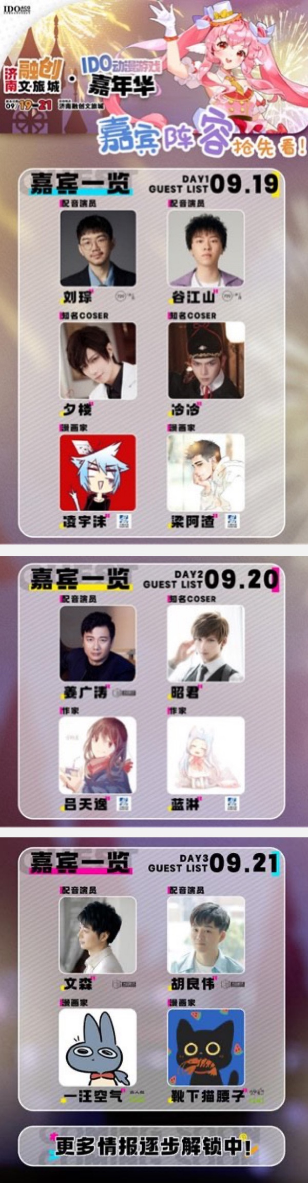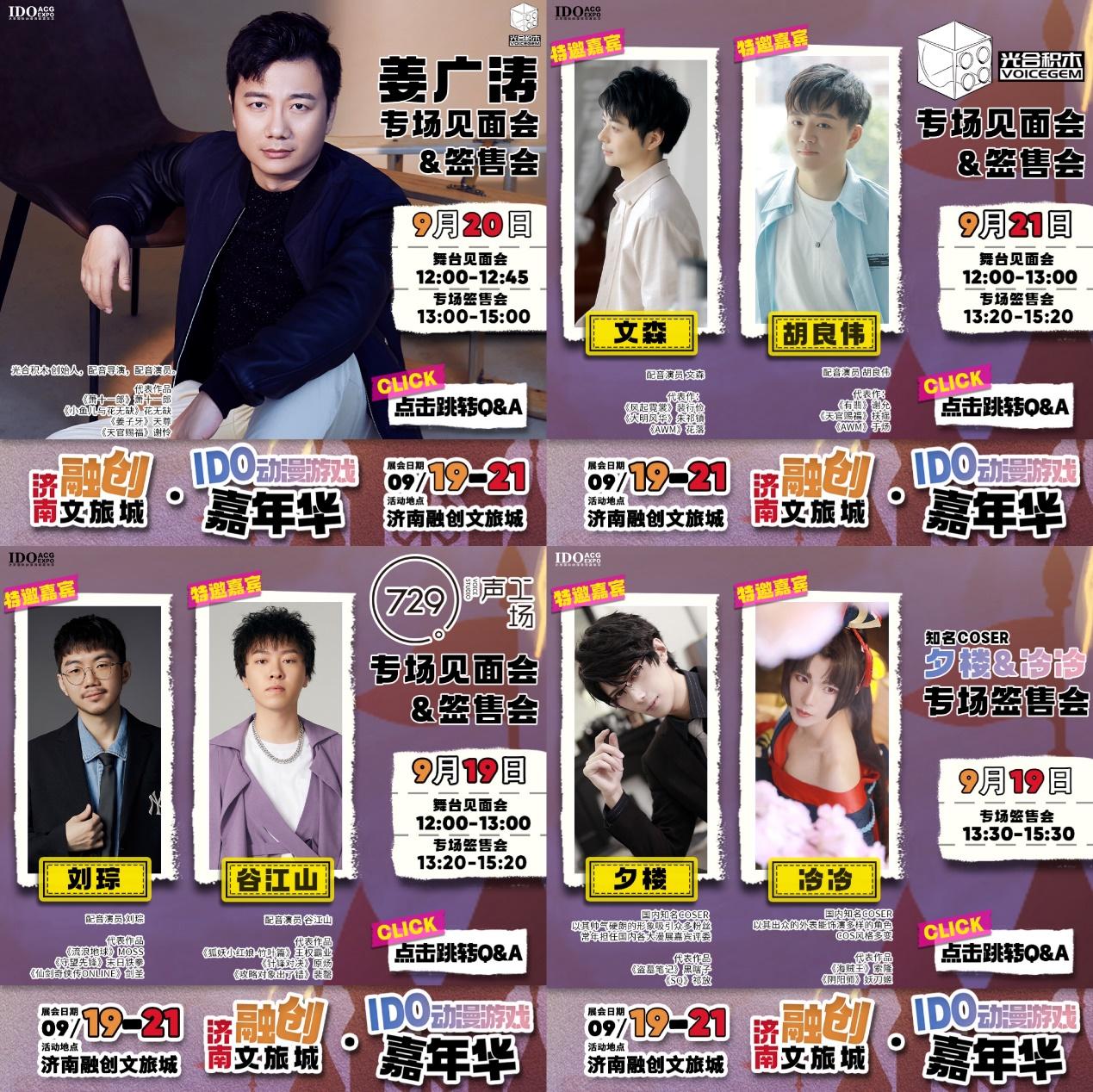 8月,国内知名动漫游戏展“IDO动漫游戏嘉年华”官方微博发布一则消息:国内实力配音团队“光合积木”的声优大咖姜广涛、文森&胡良伟,“729声工场” 团队刘琮&谷江山、COSER夕楼&冷冷等重磅嘉宾将于9月19日至21日举行粉丝见面会与签售会,地点就在济南融创文旅城。一石激起千层浪,在动漫圈引起不小的震撼。“国内知名动漫展+济南最热打卡地”的神奇组合,能带来怎样的火花和新鲜玩法,十分令人期待。