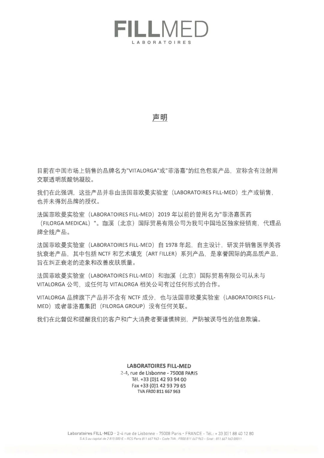 8月21日,法国FILLMED菲欧曼(原Filorga菲洛嘉)的中国独家经销商——珈溪(北京)国际贸易有限公司(下称珈溪公司),也在官方微信公众号“FILLMED菲欧曼”发布声明,表明菲洛嘉(北京)医疗器械有限公司及其销售的红盒装“Vitalorga菲洛嘉”注射用交联透明质司酸钠凝胶,与法国FILLMED菲欧曼无关。