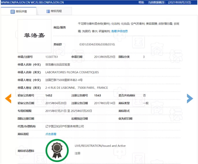 中国商标网显示,从2015年起,菲洛嘉化妆品实验室和珈溪公司,都曾在国内数次申请注册“菲洛嘉”10类(医疗器械)商标,但一直未成功。截至今年8月4日,菲洛嘉化妆品实验室依然在继续申请。