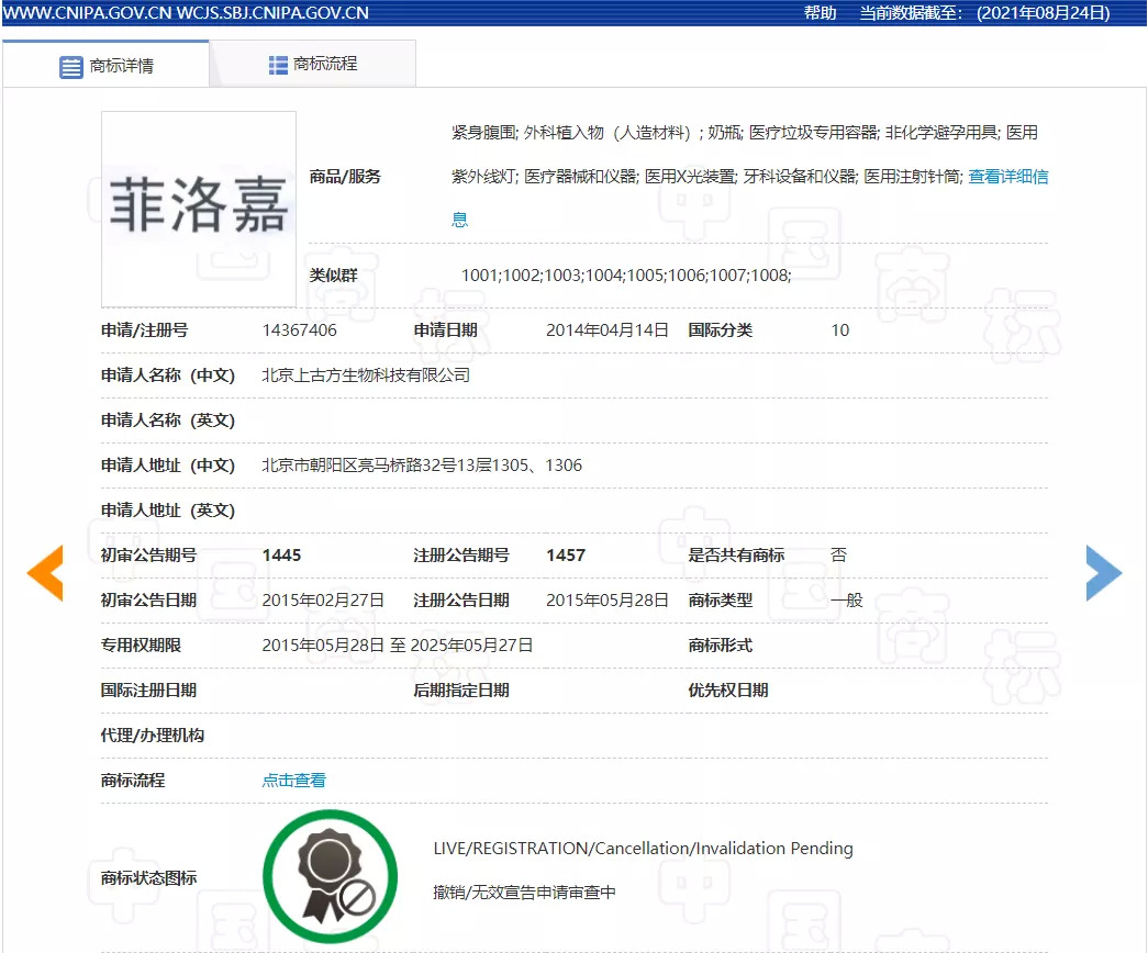 品观APP进一步查到,刘江波名下还有另一家公司——北京上古方生物科技有限公司(下称北京上古方)。这家公司成立于2013年,目前拥有“菲洛嘉”10类(医疗器械)商标权。