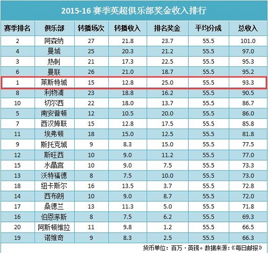 遵循这一原则我们可以看出,阿森纳虽然在积分榜上落后莱斯特城,但是作为一支豪门俱乐部,其拥有众多球迷,票价也在联赛中最高,因此枪手转播场次为联赛最多的27次,获得设施费2180万英镑。相比之下,狐狸的转播场次为15次,设施费就只有1280万英镑,但作为英超冠军,其还是可以获得联赛最高的2500万英镑的排名奖励。
