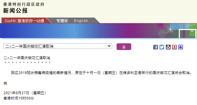 8月27日,香港特区政府网发布新闻公报显示,因应新型肺炎疫情的最新情况,原定于今年10月1日在维港举行的国庆烟花汇演将会取消。