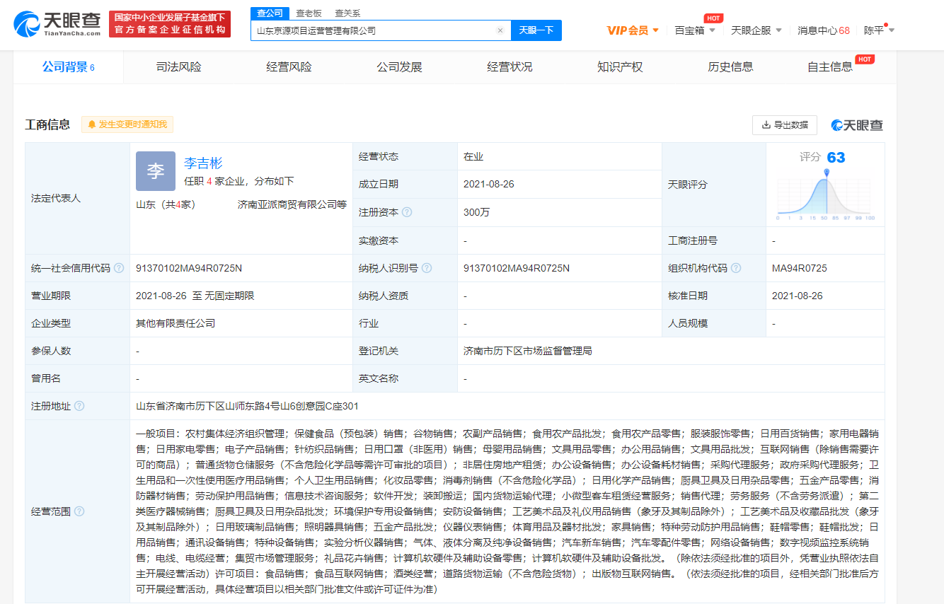 据天眼查APP显示,8月26日,山东京源项目运营管理有限公司成立,法定代表人为李吉彬,注册资本300万,经营范围包括食品销售;酒类经营;道路货物运输;出版物互联网销售等。