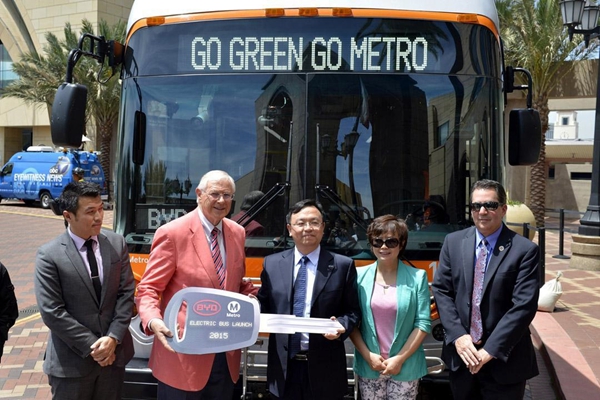 ▲图:王传福向洛杉矶市移交比亚迪电动大巴K9