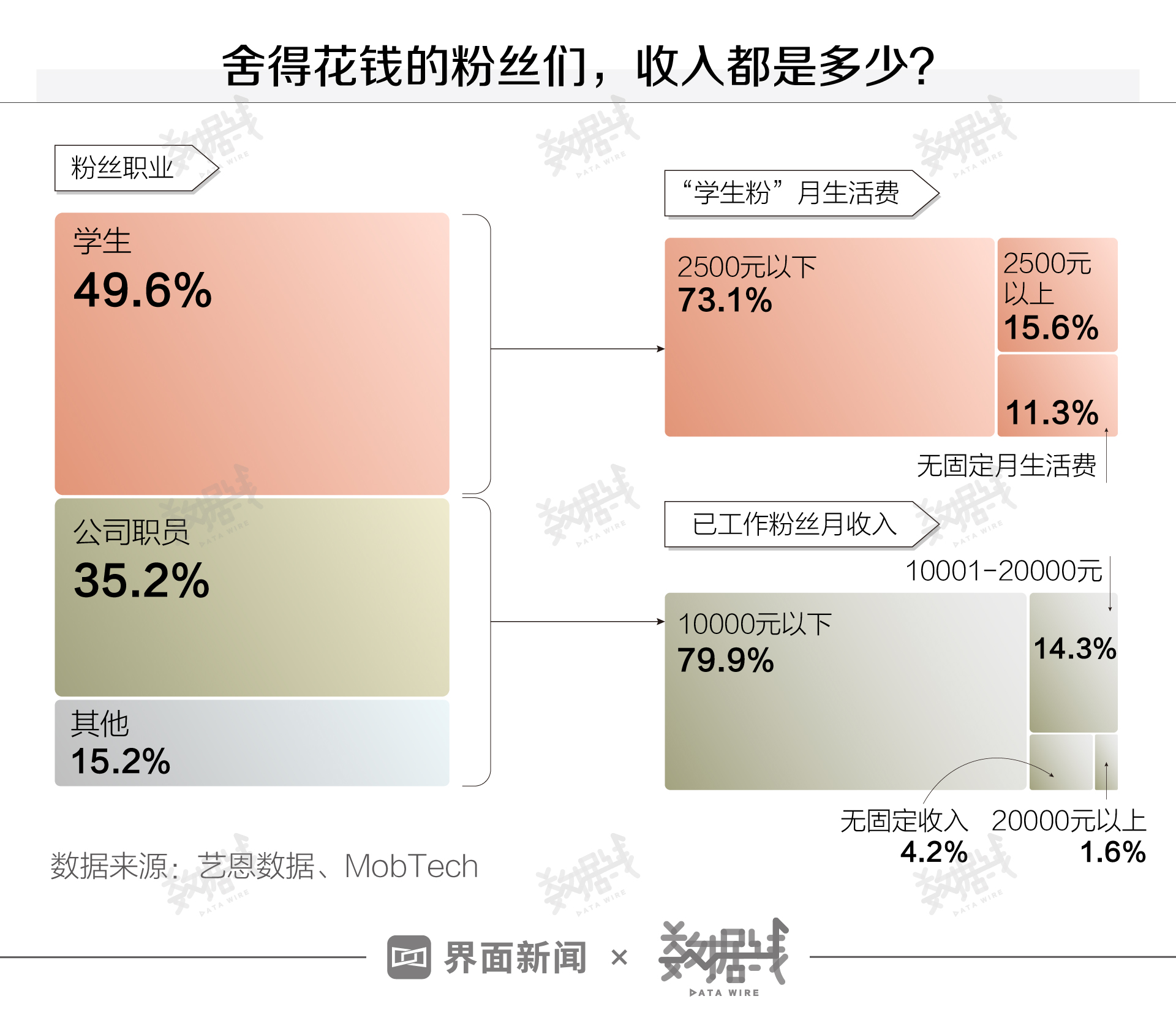 “打投冲榜”“应援集资”“刷销量冲业绩”,“饭圈”消费越来越高,粉丝还吃得消么?据艺恩数据,“追星”粉丝群体中,近5成都是学生。其中,7成以上“学生粉”月生活费低于2500元。已经工作的粉丝群体中,近8成月收入不足1万元。