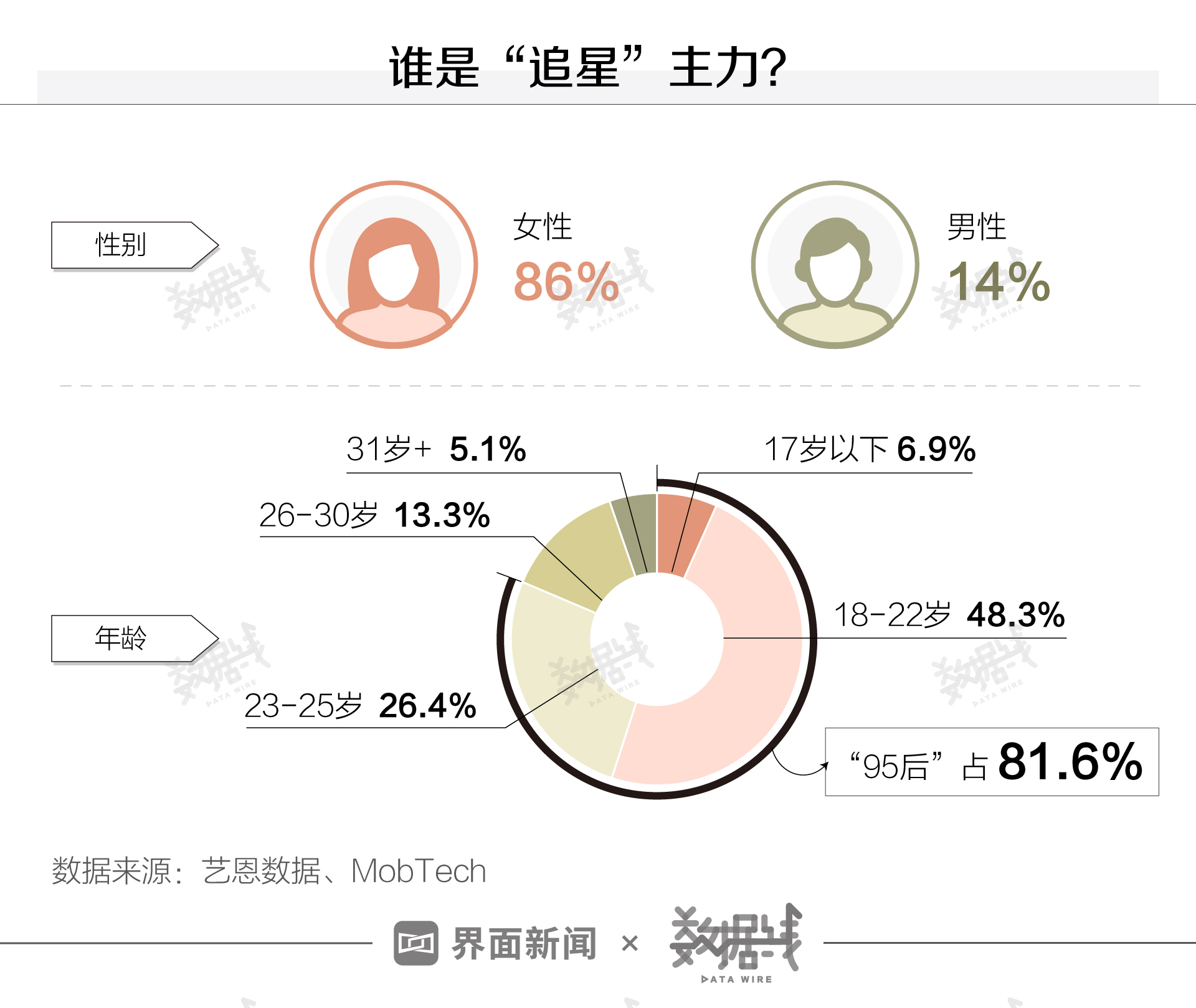 “追星族”中年轻女性居多。据艺恩数据,8成以上粉丝都是女性,且年龄普遍较低,“95后”占比达81.6%。