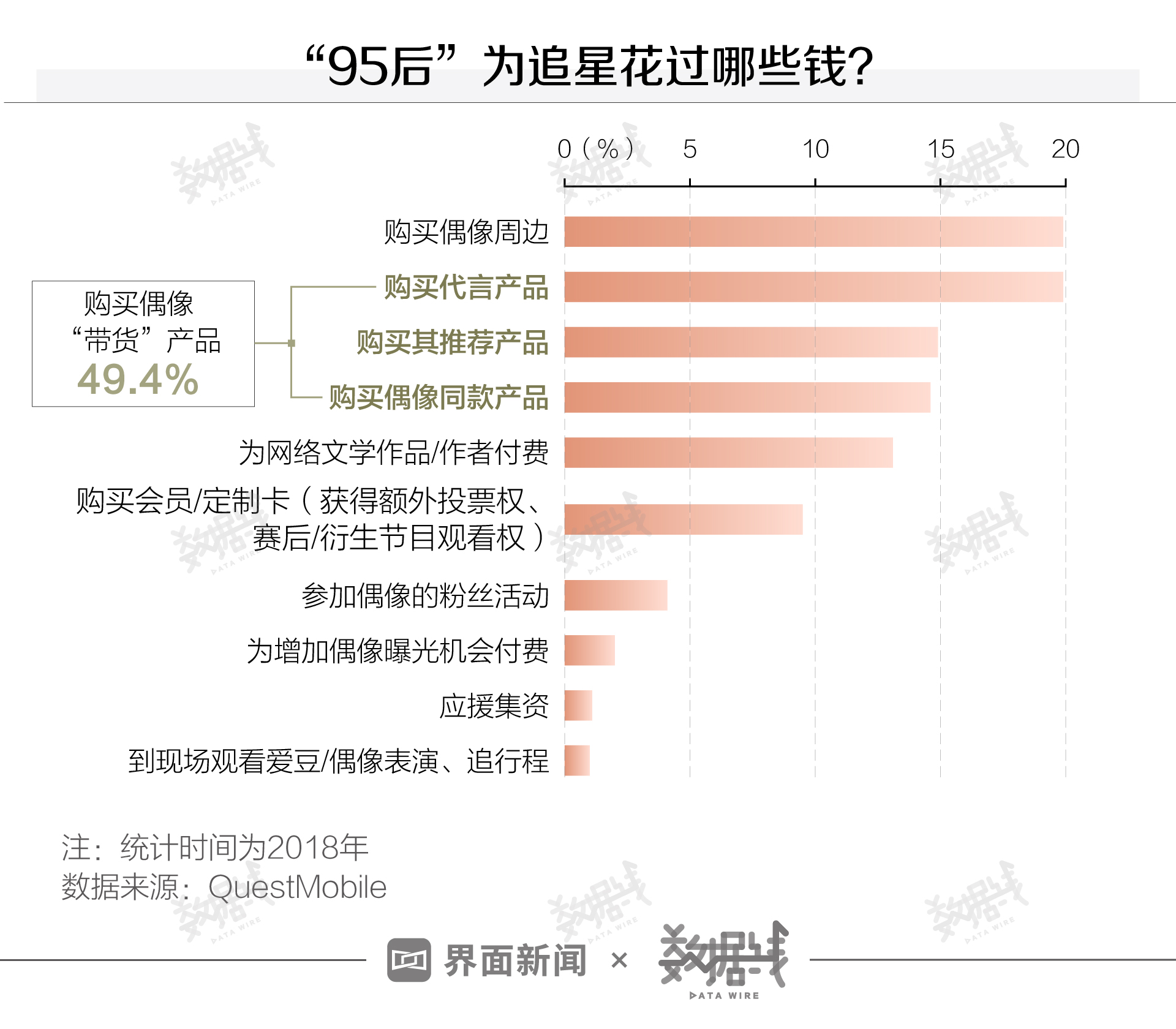 粉丝是怎么“氪金”的?据QuestMobile数据,“95后”粉丝群体“追星”的开销中,近一半都花在了购买偶像代言、推荐或同款产品上。