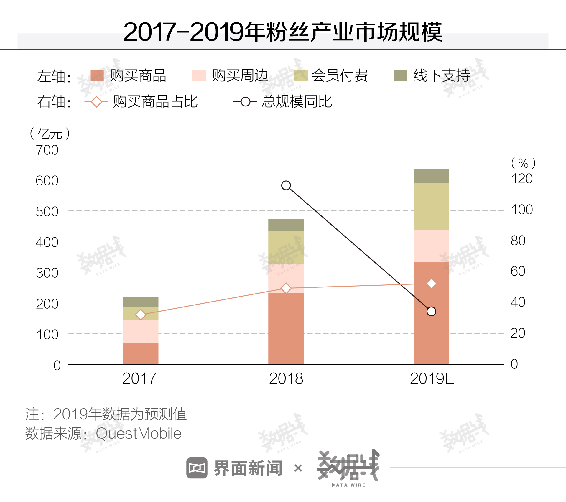 粉丝产业市场规模3年间增长近200%。据QuestMobile,2017年至2019年,粉丝产业市场规模从200多亿元增长至超600亿元(预测值),涨幅接近200%。其中,粉丝“购买商品”占比从3成增长至超5成,成为最“吸金”的项目。