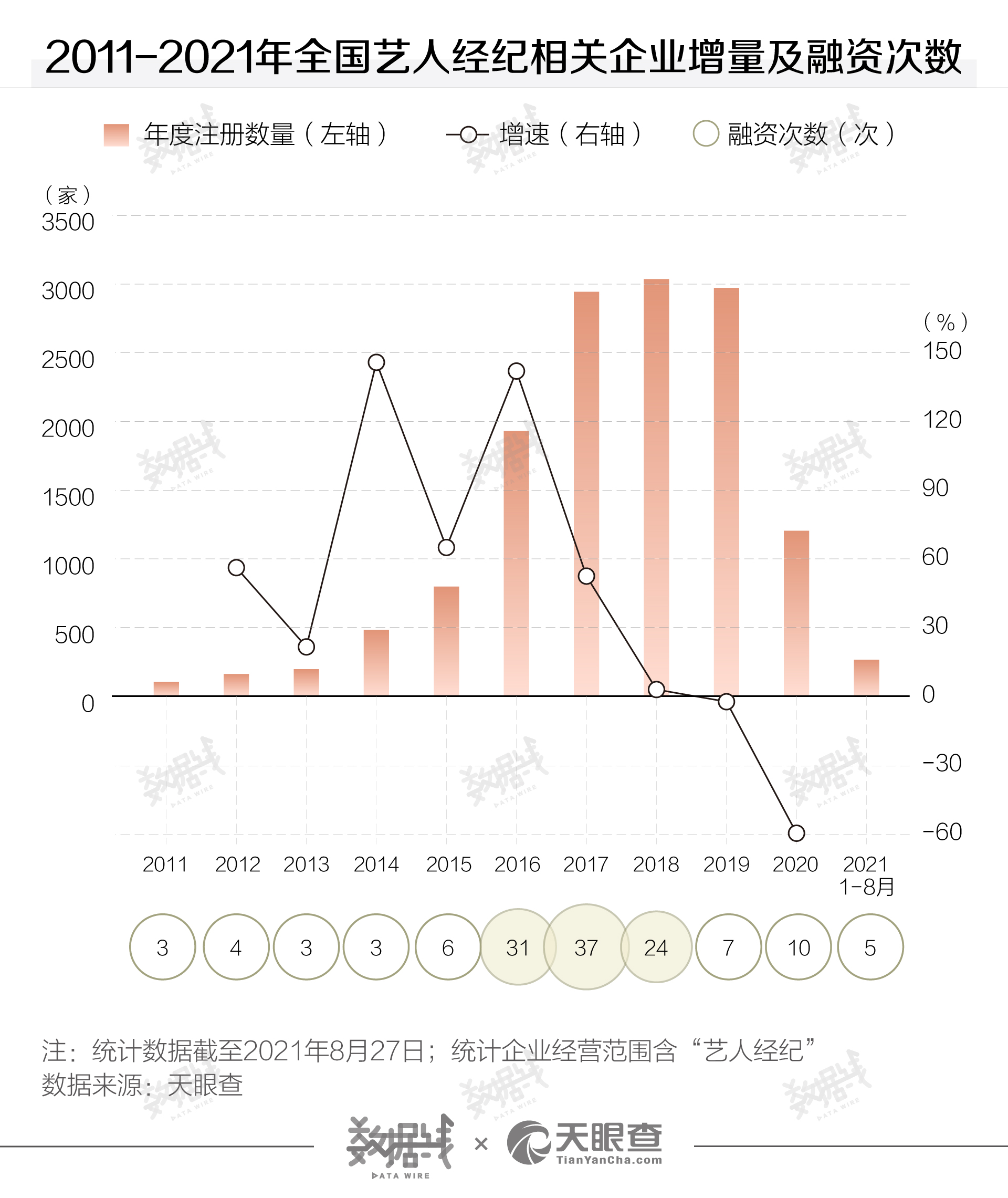 偶像经纪公司“热潮”已过,新增数量和融资数量都在下降。据天眼查数据,从企业增量来看,2016年,中国偶像经纪公司开始“井喷”。截至2020年,中国艺人经纪相关企业年度注册数量连续5年保持在1000家以上。其中,2018年企业注册数量最高,超过3000家。但2019年至2020年,艺人经纪相关企业年度注册数量已连续2年下降,降幅约60%。截至目前,2021年新增艺人经纪相关企业265家,以此估算,全年新增企业数量或将继续下降。