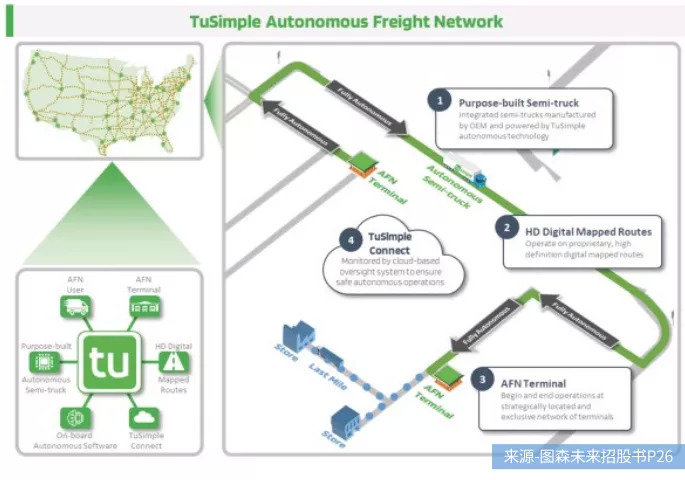 据招股书介绍,此系统主要利用图森未来特有L4自主半卡车,采取“即插即拔”的模式,建立运输中心,通过无人驾驶卡车进行点对点运输。