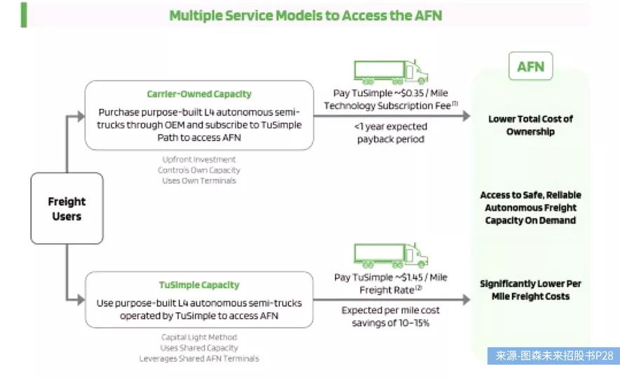 AFN的收费模式有两种:一是第三方购买自动驾驶卡车,货运公司运营方向图森购买卡车,并订阅TuSimple软件服务,订阅费为0.35美元/英里,可为货运公司节省0.4-0.5美元/英里驾驶员成本。