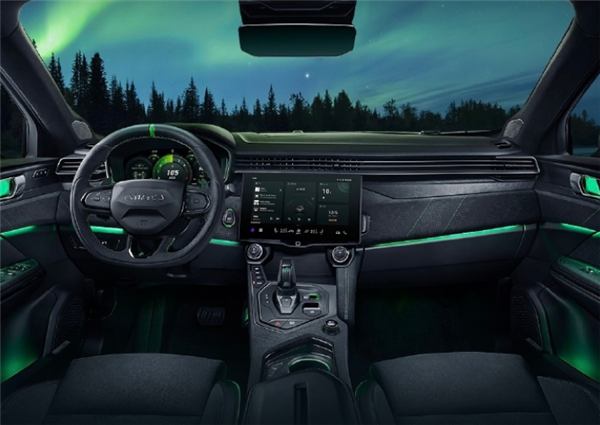 内饰方面,领克05+延续了家族化设计语言,不过在细节上进行了调整。内饰大面积采用了Alcantara材质来突显质感,配合亮眼的绿色点缀于安全带、方向盘回正环、换挡拨片、启动按钮、一体式运动座椅等位置,与外观呼应。