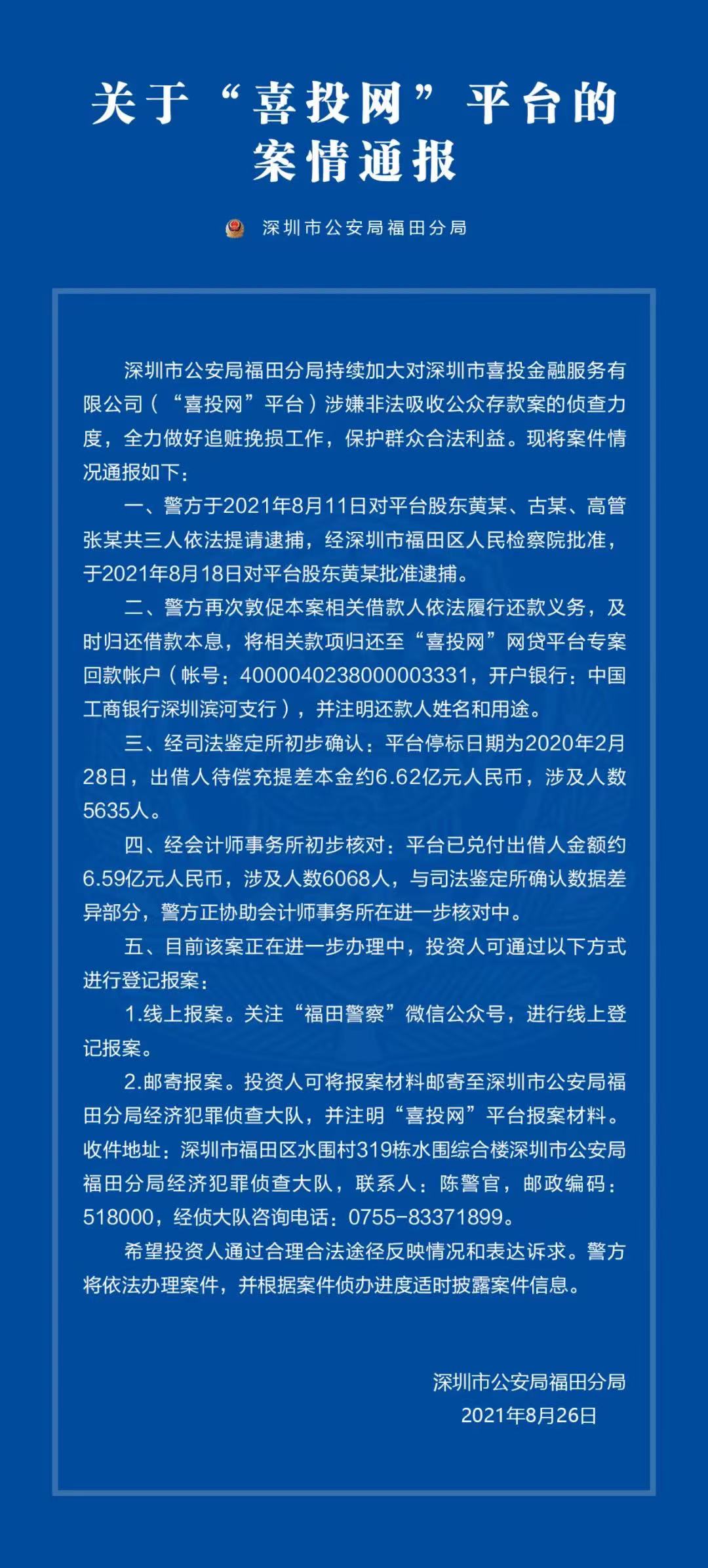 据“福田警察”微信公众号8月27日消息,深圳市公安局福田分局发布关于“喜投网”平台的案情通报,通报显示,警方于2021年8月11日对平台股东黄某、古某、高管张某共三人依法提请逮捕,经深圳市福田区人民检察院批准,于2021年8月18日对平台股东黄某批准逮捕。警方再次敦促本案相关借款人依法履行还款义务,及时归还借款本息,将相关款项归还至“喜投网”网贷平台专案回款账户,并注明还款人姓名和用途。
