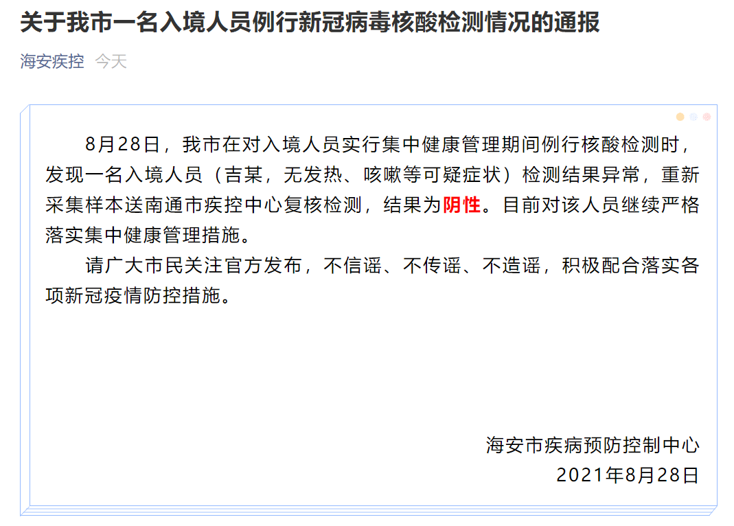 据“海安疾控”微信公众号消息,8月28日,海安市在对入境人员实行集中健康管理期间例行核酸检测时,发现一名入境人员(吉某,无发热、咳嗽等可疑症状)检测结果异常,重新采集样本送南通市疾控中心复核检测,结果为阴性。目前对该人员继续严格落实集中健康管理措施。