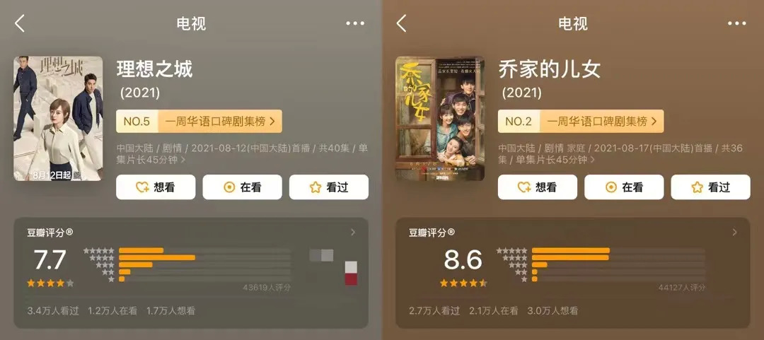 口碑方面,豆瓣达到7.7分的《理想之城》至今仍被多位网友鸣冤“分低”,《乔家的儿女》更是凭借豆瓣8.7拿到了暑期档剧集的最高开分。