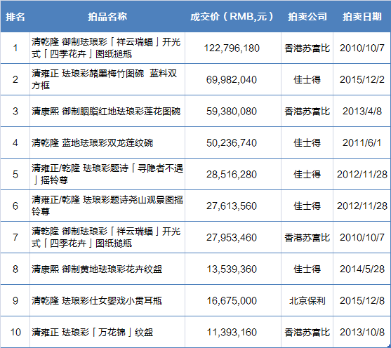2006年,著名收藏家张宗宪先生收藏的清乾隆“御制珐琅彩杏林春燕图碗”,在香港由佳士德拍卖公司拍卖,约以1.51亿港元成交;2007年,一件“御制珐琅彩庭园题诗灯笼尊”,在中贸圣佳拍卖会上以8,400万元人民币成交,创造当时中国瓷器在内地的最高成交价:2011年,一件清乾隆珐琅彩“古月轩”题诗、“锦鸡花石”图胆瓶,在苏富比拍卖会上估价1.8亿港元,但并没有成交,而是在拍卖会后以私人洽购形式2亿港元售出。