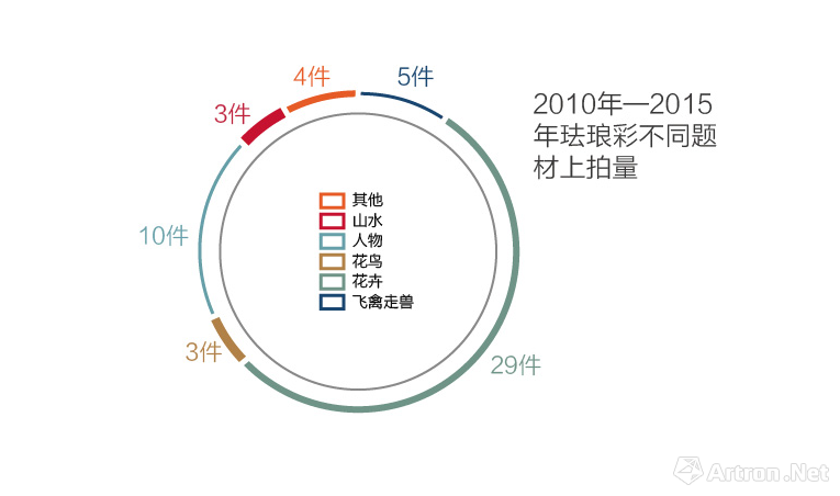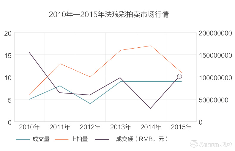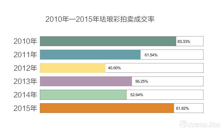 从上图中可以看出,2010年—2015年中,珐琅彩瓷器的上拍量始终很少,这与清代其他名贵瓷器有着很大的不同,珍贵的珐琅彩瓷为皇帝“内廷秘玩”,民间均不得见。直到英法联军攻入北京后,宫内珐琅彩瓷才部分流散出来,散落民间。