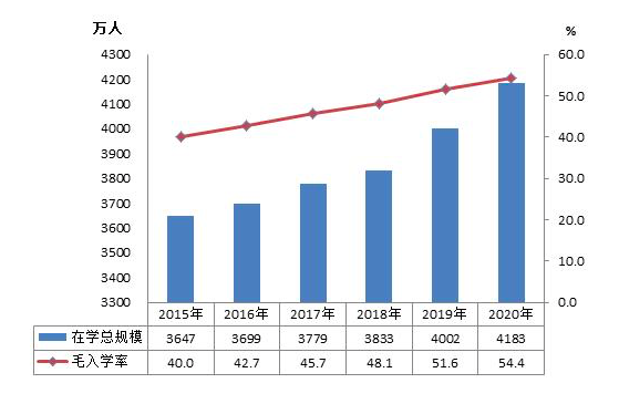 全国各类高等教育在学总规模[18] 4183万人,比上年增加181万人。高等教育毛入学率54.4%,比上年增加2.8个百分点。普通高等学校校均规模[19] 11982人,其中,本科院校15749人,高职(专科)院校8723人。