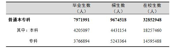 普通本专科招生967.45万人,比上年增加52.55万人,增长5.74%;在校生3285.29万人,比上年增加253.77万人,增长8.37%;毕业生797.20万人,比上年增加38.67万人,增长5.10%。另有五年制高职转入专科招生46.28万人;专科起点本科招生61.79万人。